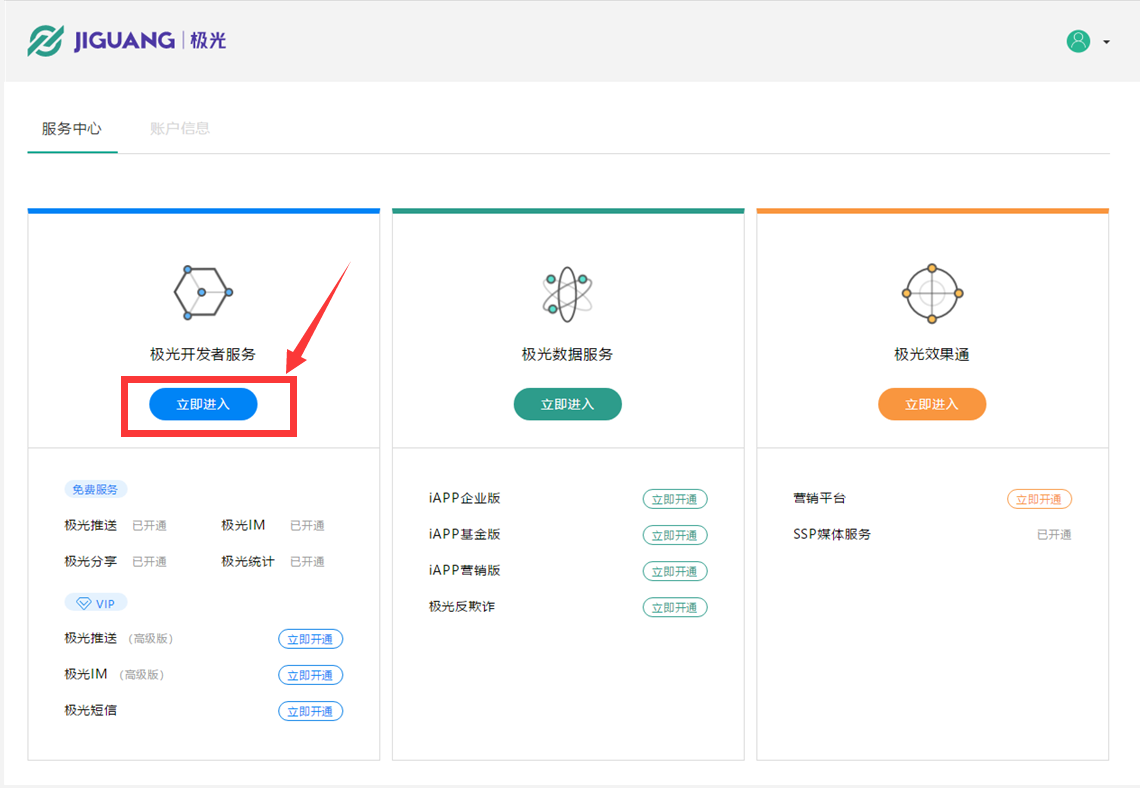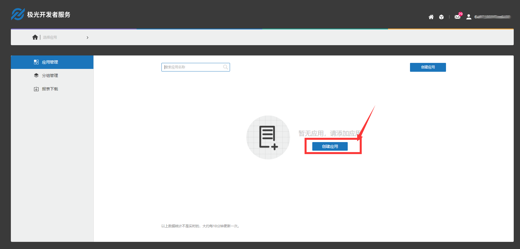 1. 进入服务中心,可以在顶部导航栏【开发者服务】——【极光推送】中,进入以下页面;