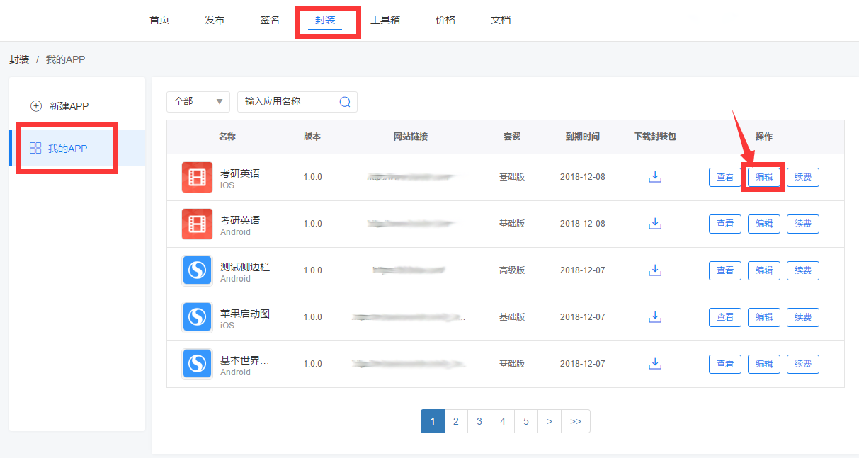 第六步 登录平台网站,在【封装-我的APP】中选择,需要编辑极光推送的APP,点击编辑,以APP【考研英语】为例。